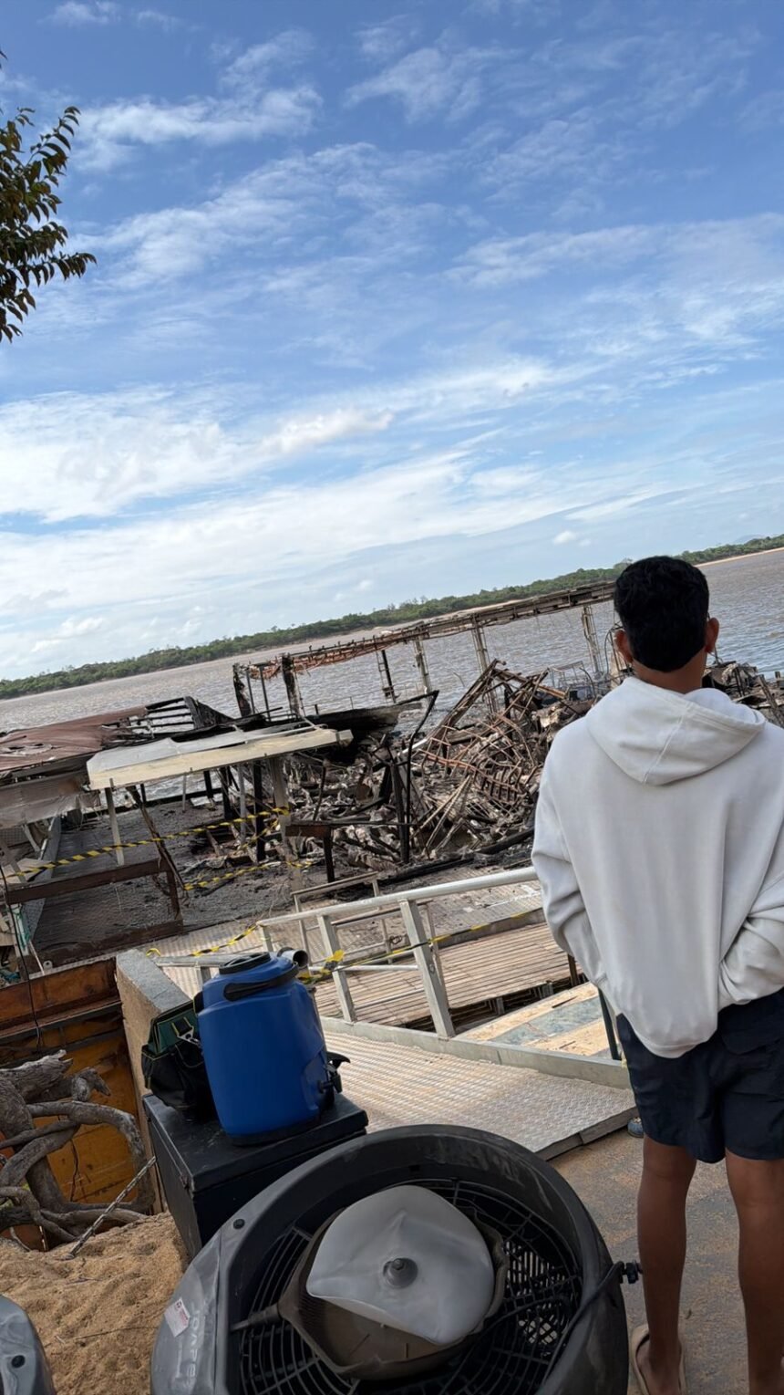 Imagens registradas após o ocorrido mostram que o incêndio destrói flutuante no Rio Branco de forma devastadora, deixando apenas destroços no local.